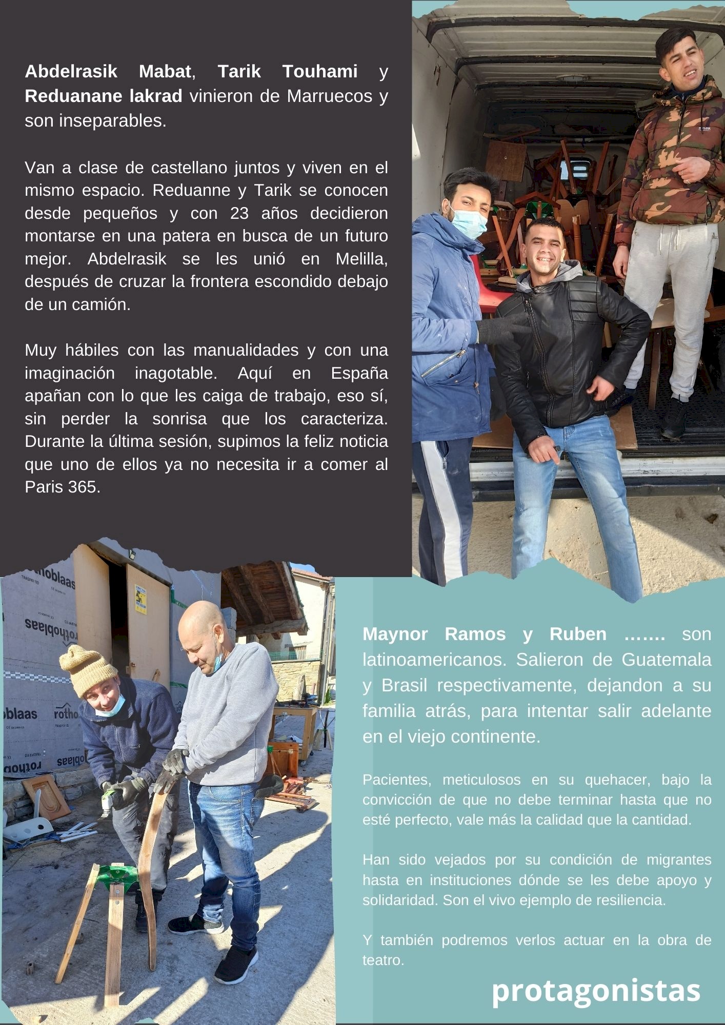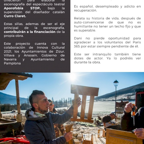La escenografía es un conjunto 46 sillas, todas piezas únicas, realizadas con absoluta libertad creativa por sus autores-- personas usuarias del comedor solidario París 365- y siguiendo las pautas estéticas del diseñador, a partir de materiales de deshecho donados por Traperos de Emaús Navarra.